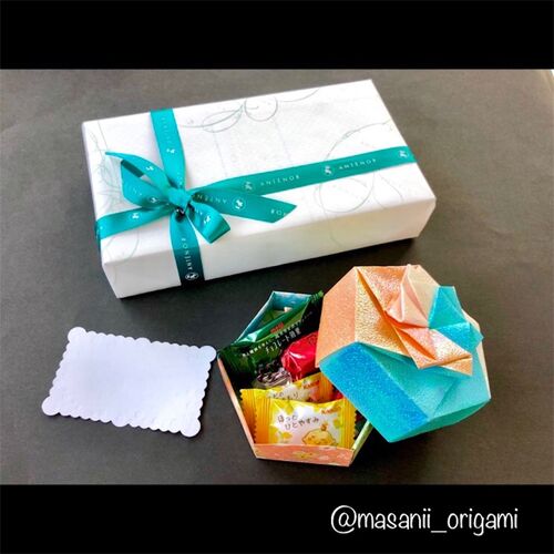館長、またやってくれました。 世話になっている書道の先生に贈るそうです。何というセンス。 使った箱は、とらやの羊羹。外と中のギャップを持たせるため、あえて箱の外装は黒いまま。開けてびっくりさせるんだそうです。 プロポーズかよ! 折り紙を始めて…