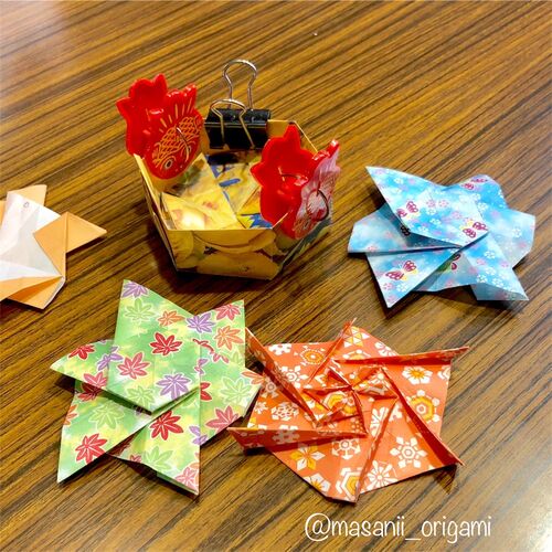 ふたたびユニットの箱。Tさんはテキストのほとんどをマスターする勢いで、様々なパターンの箱を作り上げていきます。 写真にある風車みたいなものは、六角家のフレームにはめ込む飾りです。らせん状に折るのが難解で苦戦していましたが、自力で(しかも片手…