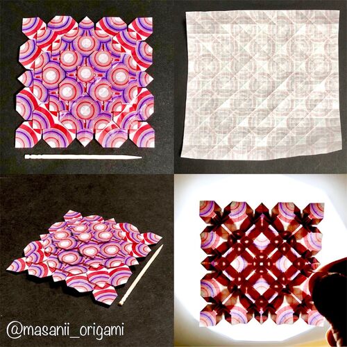 前回と同じ紙で「花折りピラミッド」を折りました。 絵柄が中心から規則的に広がっているので、相性が良いといえば良いのですが…まるでチョウの目玉模様のようです。 元の紙はこちら。 「眼状紋(eye spot)」と呼ばれ、ヤママユガやジャノメチョウ(蛇目蝶…