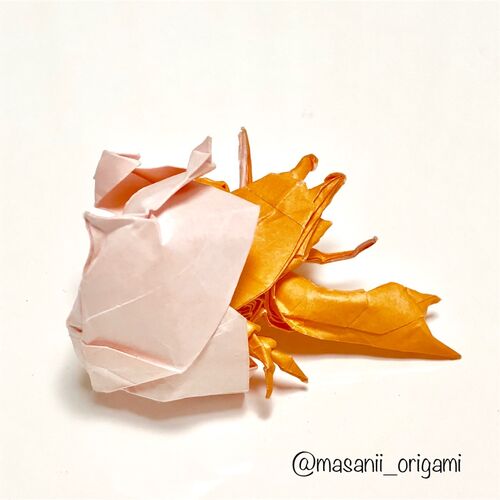 神谷哲史「ヤドカリ」を折りました。 24cm×24cmの教育折り紙。テキストの見本のようにリアルなやつ作りたかったんですけどね…紙的にコレが限界です。大きさはともかく、紙が厚過ぎて物理的にムリ\(^o^)/ でもまぁ、右手のヨロイっぽい感じとか、貝の立体感…