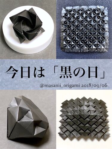 9月6日は「黒(くろ)の日」ということで、黒い作品をピックアップしてみました。 使ったのは、普通の教育折り紙。どれもサイズは15cm×15cmです。 ブラックローズ 川崎敏和氏の「バラ」。いわゆる川崎ローズです。 あじさい井桁・詰め(5×5) 複雑な作品…