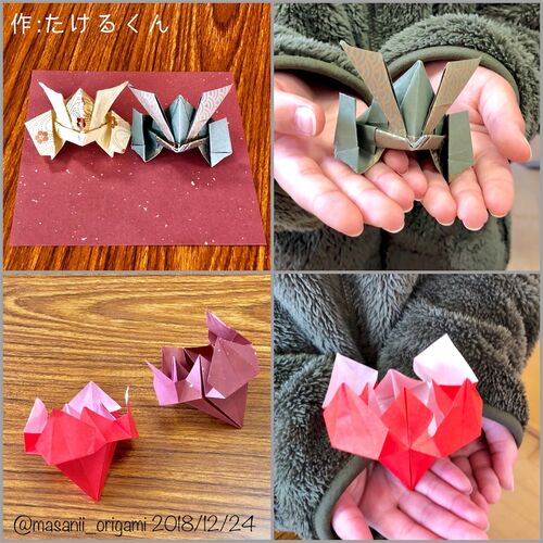 先日の講座で、たけるくん(小3)が折ってくれた作品をご紹介。 月刊おりがみ513号(2018年5月号)の「兜」。 それから、自分で考案したという「縄文土器」を見せてくれました。 …と、ここまで書いていて気付きました。今日はクリスマスイブじゃないか! ど…