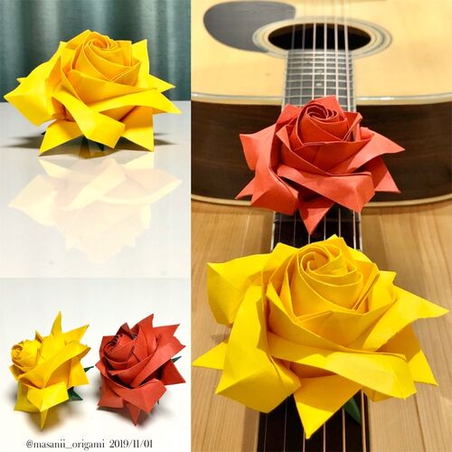 先日から量産しはじめた「剣弁高芯咲きのバラ」。 4つ目のチャレンジは、タント35cmの黄色です。 夏の太陽のように明るいカラーは、折っていても眩しくなるほど。大輪のバラの存在感をさらに際立たせています。 朱に近い赤色をした隣のバラも、この黄色を前…