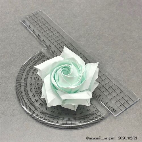 青緑色の潜在色をもつ「クラッポマーブル」のホワイト。 この紙で折る佐藤ローズは、内側に青色を秘め、実に味わい深い仕上がりになります。(2019/12/31) masanii-origami.hatenablog.com 上記の記事ではA3サイズ(29.7cm)を使っているのですが、これは佐…